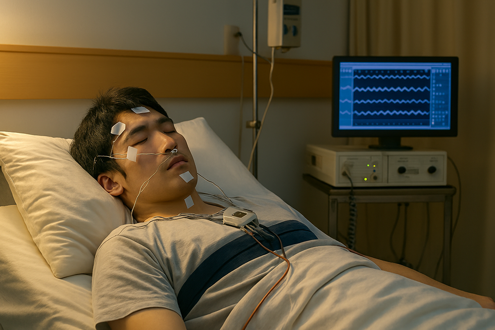 수면 중에 뇌파, 눈 움직임, 호흡, 심전도, 산소포화도, 근전도, 코골이 소리, 몸의 움직임 등을 종합적으로 측정하고 기록하여,